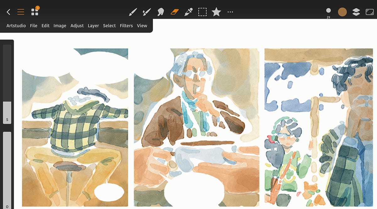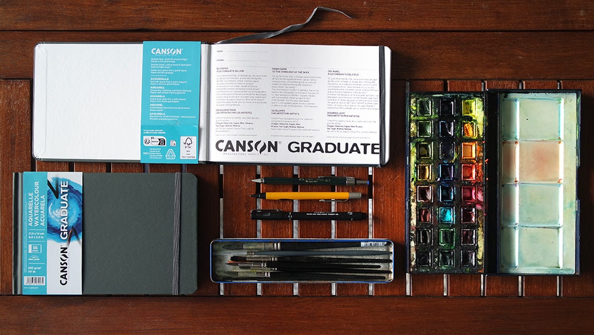 As drawing tools, we bring our Winsor & Newton watercolor palettes, a few Raphael SoftAqua brushes of various sizes, mechanical pencils for early sketches and 0.3 Unipin black pens for the line.